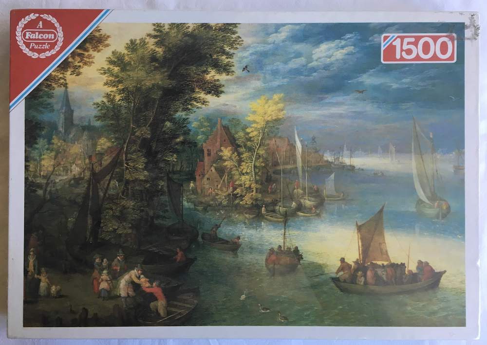 This is a beautiful and rare puzzle by Falcon. The complete title is River Landscape with a Village and a Landing, by Jan Brueghel the Elder, although there is no reference to the painting or the artist in the box.
