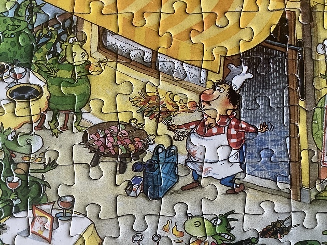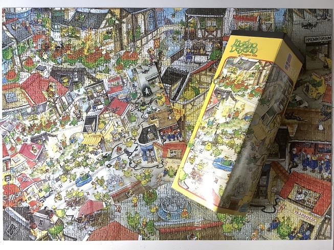 This is a rare puzzle that Heye manufactured in 1990. The title is Dragon Ville, by cartoonist Marino Degano.
