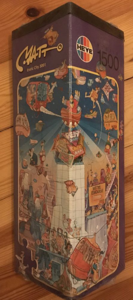 Heye manufactured this puzzle in 1996. The title is Erotic City 3001, by Carlos Matera, Matt. Like most old Heye puzzles, it is very difficult to find.