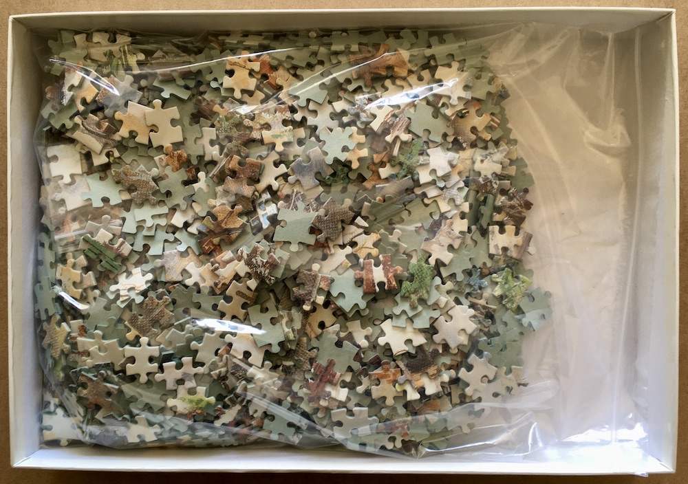 The puzzle is COMPLETE (1500 pieces). The pieces are in excellent condition. The box is in very good condition, with some shelf wear.