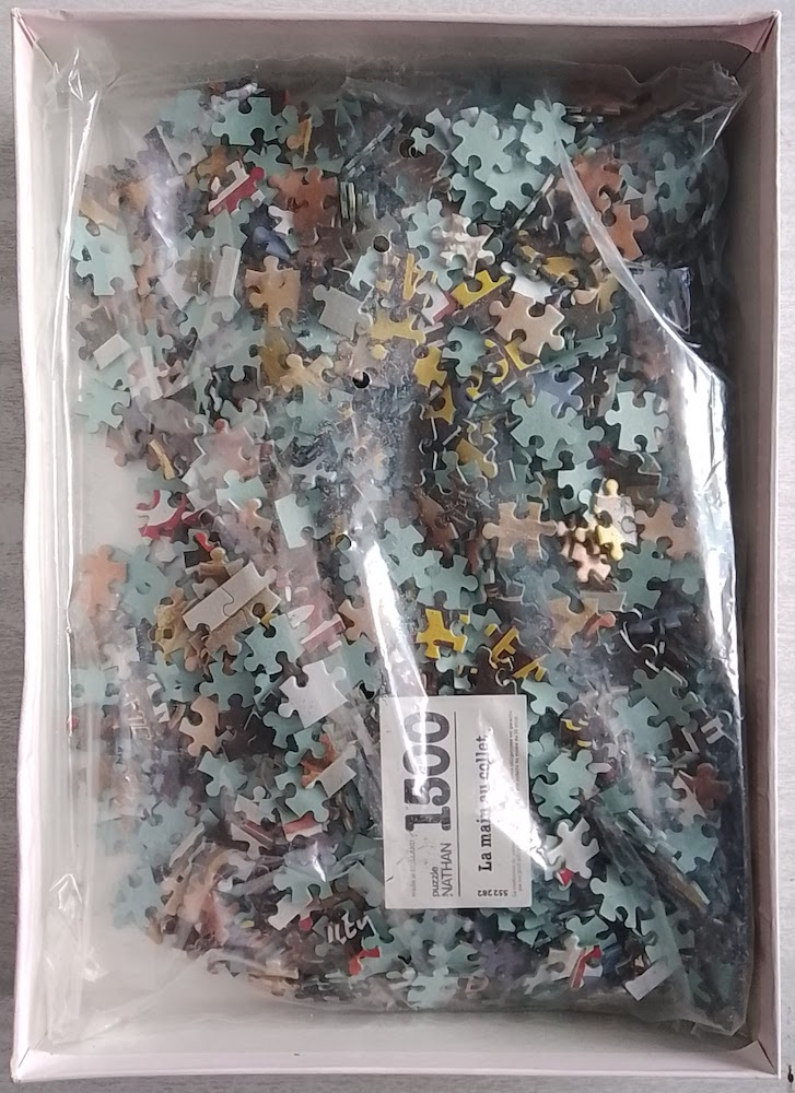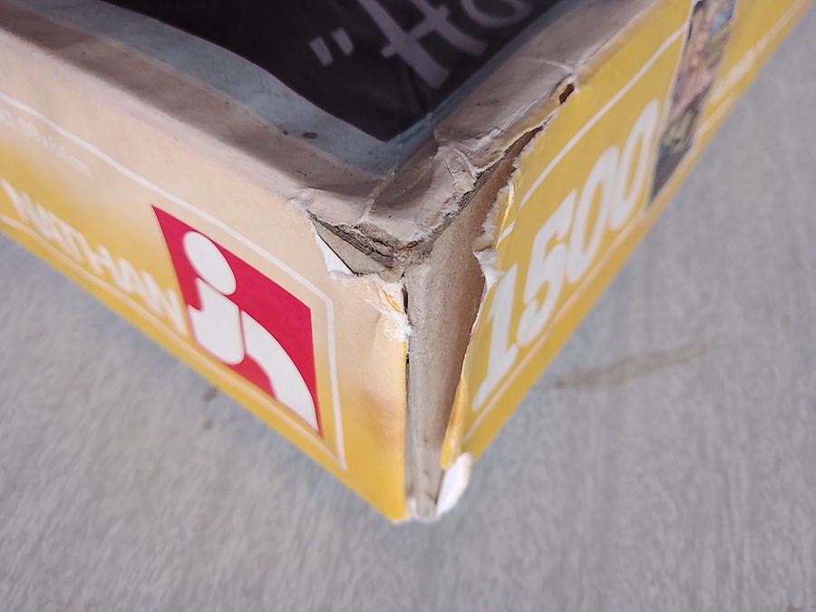 The puzzle is like NEW, with all the pieces SEALED inside the original plastic bag. The box is in fair condition, with damage on the lid, wear and scuffs on corners, discoloration, and a tear on a corner.