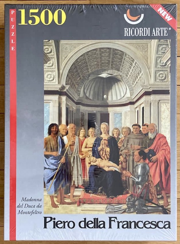 Ricordi manufactured this puzzle in 2004. The title is Brera Madonna, by Piero della Francesca, although other titles for this painting are Pala di Brera, the Montefeltro Altarpiece, or Brera Altarpiece. The title in the box is Madonna del Duca da Montefeltro, since Federico Montefeltro commissioned this painting to celebrate the birth of his son.