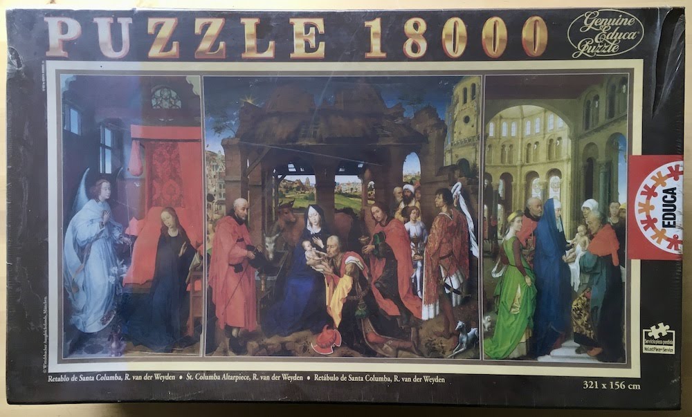 Educa produced this magnificent puzzle in 2003. It is large, challenging, and very difficult to find today. The title is St. Columba Altarpiece, by Rogier van der Weyden.