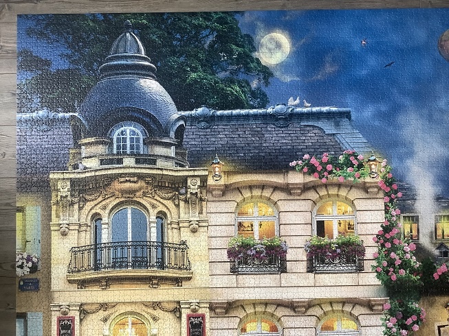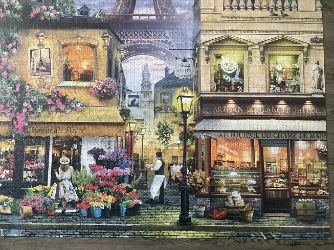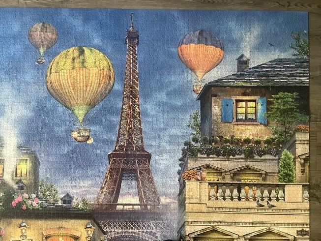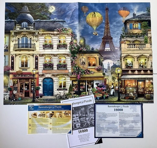 Ravensburger manufactured this challenging puzzle in 2019. The title is Evening Walk in Paris, by Howard Robinson.