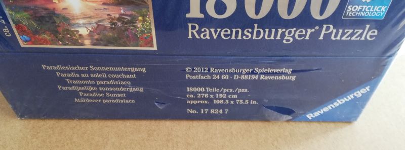 The puzzle is NEW, with its original FACTORY SEAL. The seal has multiple tears, as you can see in the photographs, but the box is in very good condition, with just some shelf wear.