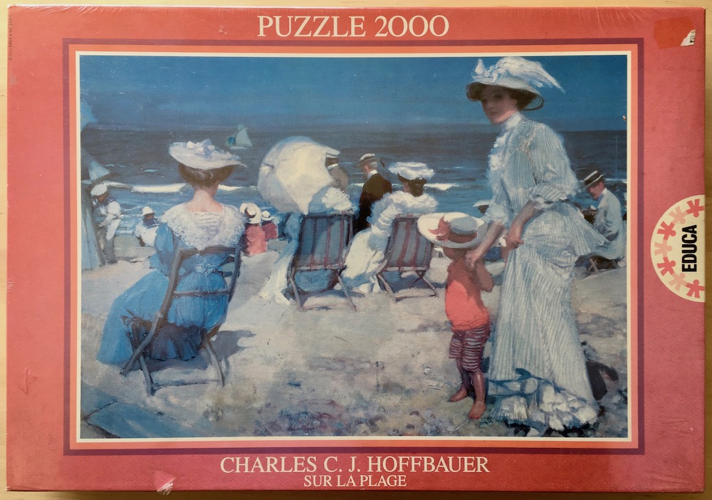 Educa manufactured this beautiful puzzle in 1992. The title of the painting is The Beach, by Charles Hoffbauer. It has been out of catalog for a long time and it is now very difficult to find. There is another 1500 piece version that Educa published in 2001. Although both versions are difficult to find, this original edition is the rarest one.