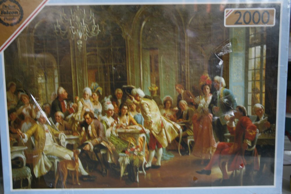 This is another interesting puzzle by Falcon. The title is An Elegant Soirée, by August Hermann Knoop. He specialized in the richness of the materials of the day and the homes enjoyed by the aristocracy, which are evident in many of his paintings.