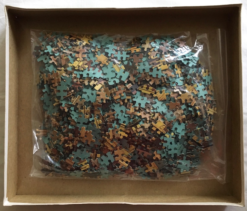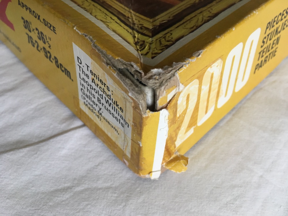 The puzzle is COMPLETE (2000 pieces). The pieces are in very good condition, although they are thinner than usual. The box is in just fair condition, with tears in the corners and significant wear.