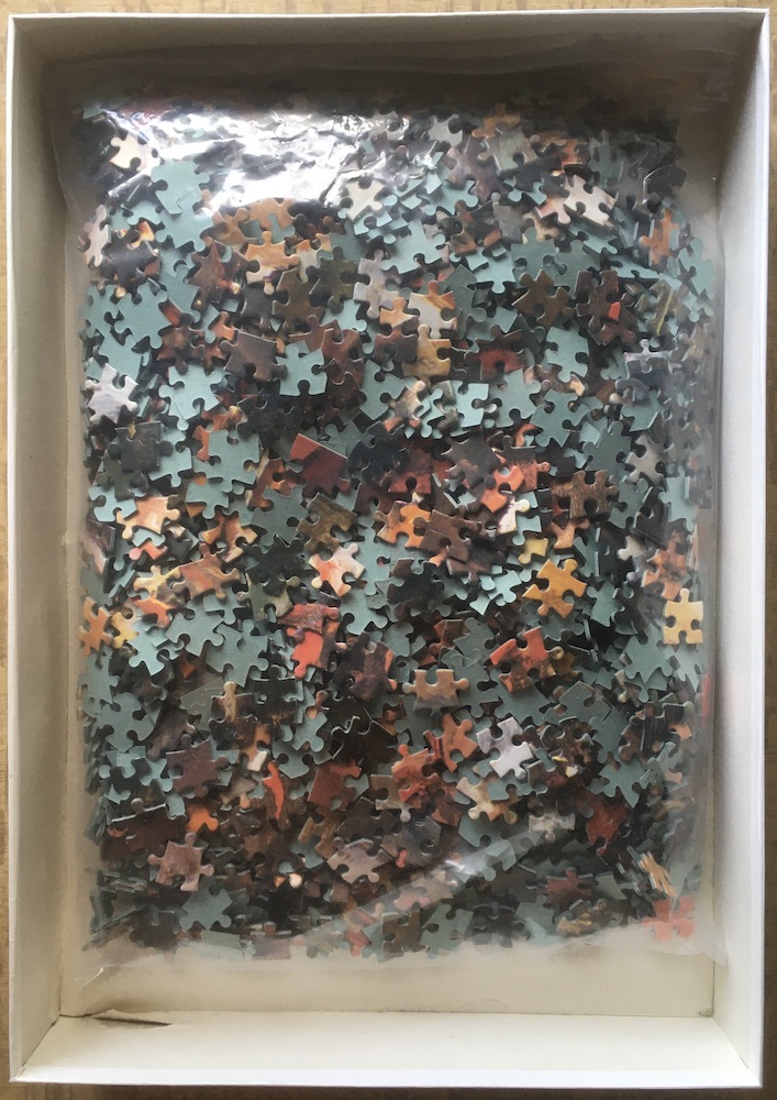 The puzzle is COMPLETE (2000 pieces). The pieces are in very good (almost excellent) condition. The box is in good condition, with visible wear and scuffs on corners and edges, and a slight depression on the base.