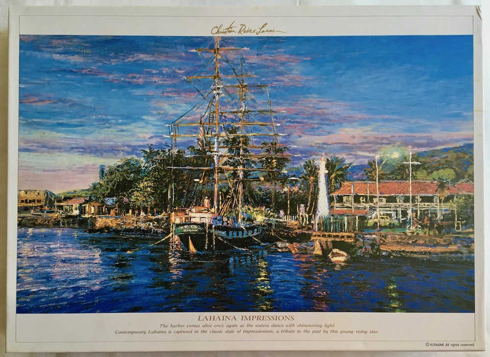 The Japanese brand Konami manufactured this rare puzzle in 1992. The title is Lahaina Impressions, by Christian Riese Lassen. It is very difficult to find outside of Japan.