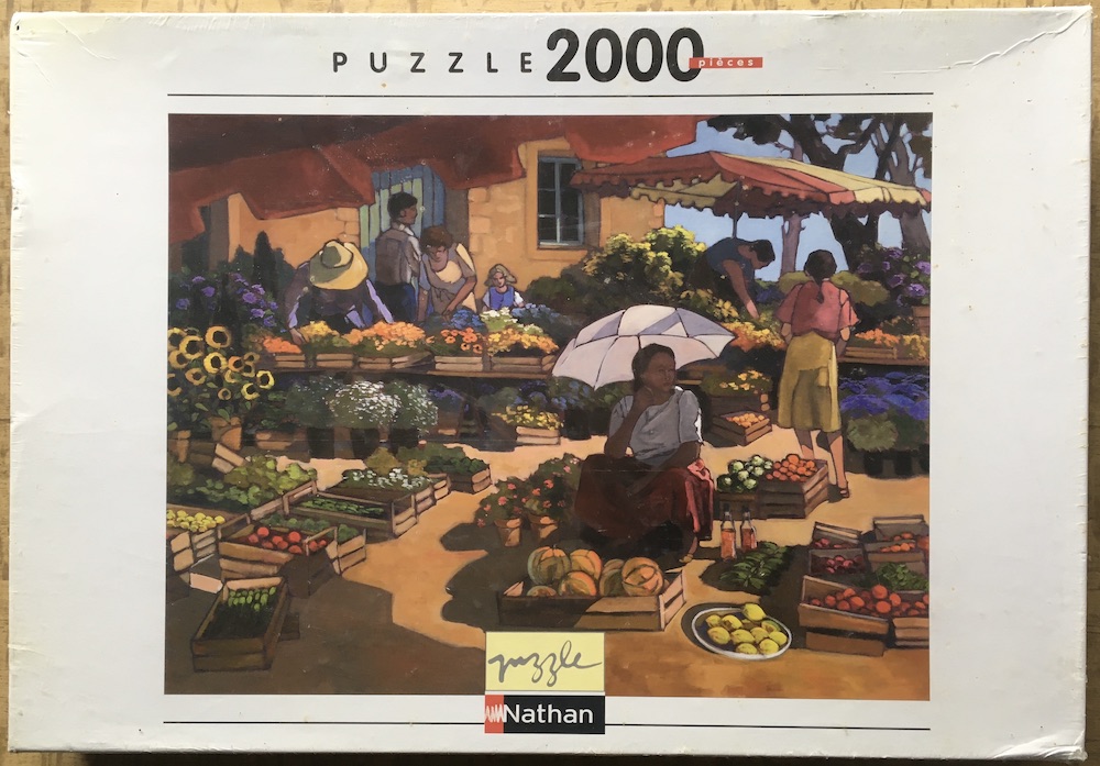 This is a beautiful puzzle by Nathan, belonging to their Artiste collection The title is Women at the Market, by Lorraine Jordan, although the title in the box appears only in French: Femmes au Marché.