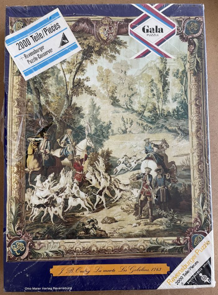 This is a very old and rare puzzle that Ravensburger produced in 1972. The title is The Chase, by Jean-Baptiste Oudry.
