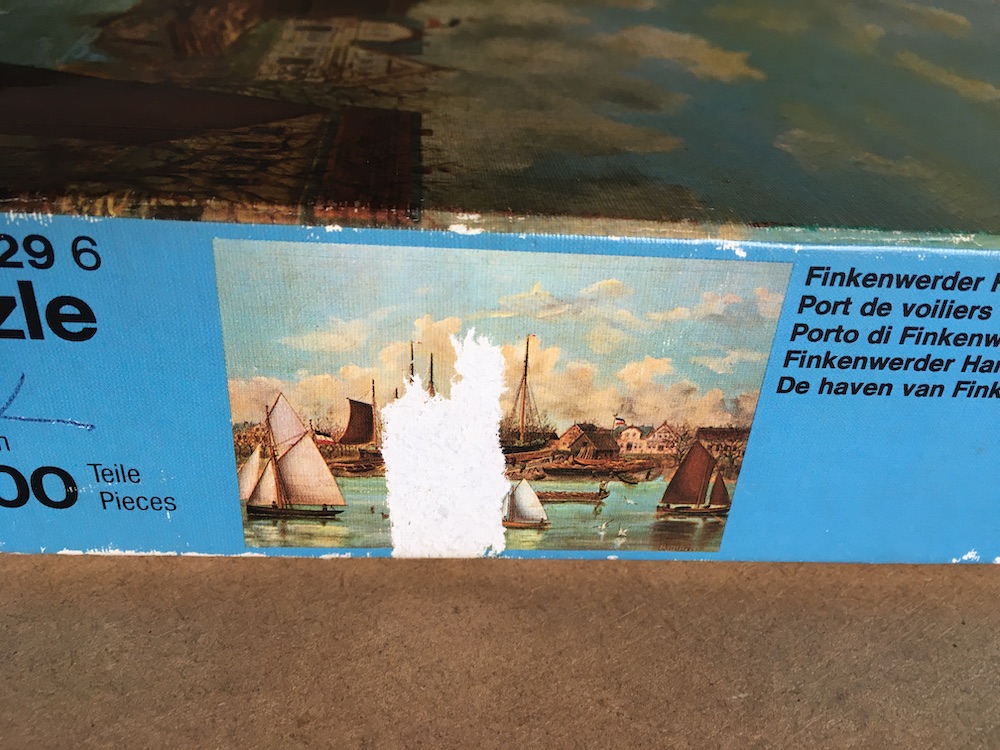 Ravensburger published this old puzzle in 1979. The title is Finkenwerder Harbor, although there is no reference to the artist on the box. It is very rare.