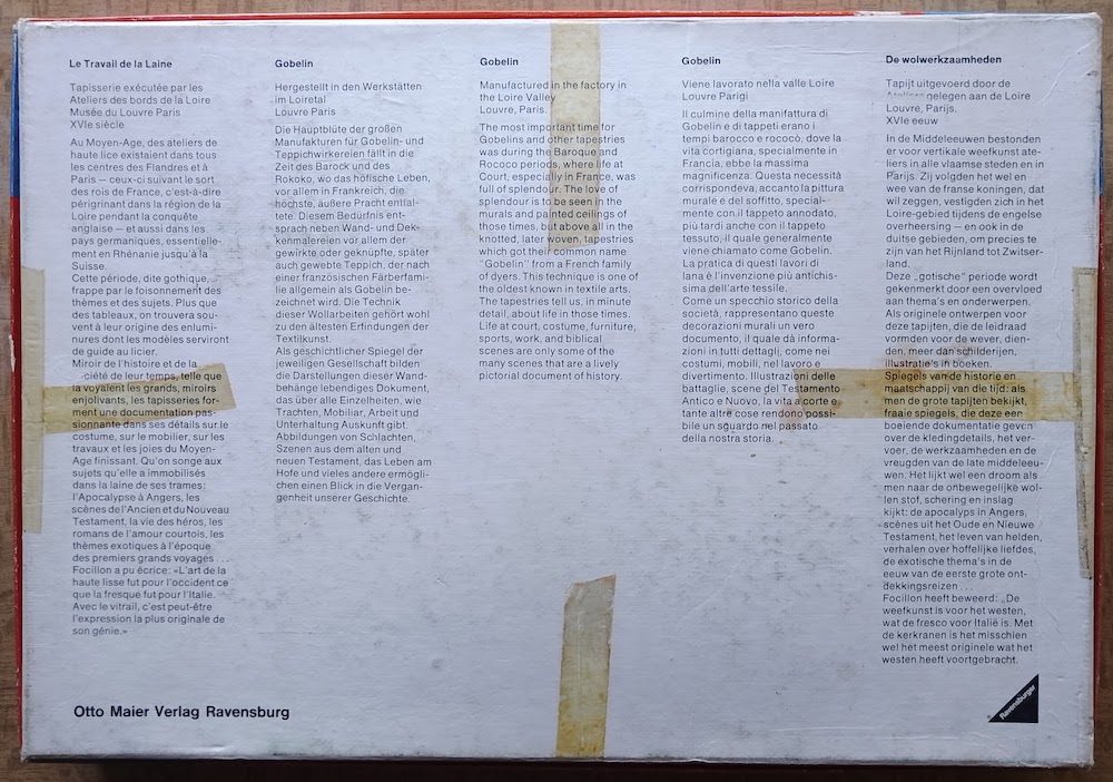 Ravensburger manufactured this extraordinary puzzle in 1976. The English title on the box is simply Gobelin, which was the initially the name of a medieval family of dyers. The original and complete French title of this tapestry is Le Travail de la Laine, de la Tenture de la Noble Pastorale. You can admire the tapestry at the Louvre Museum, in Paris. As you can see, the image in the puzzle is flipped horizontally.