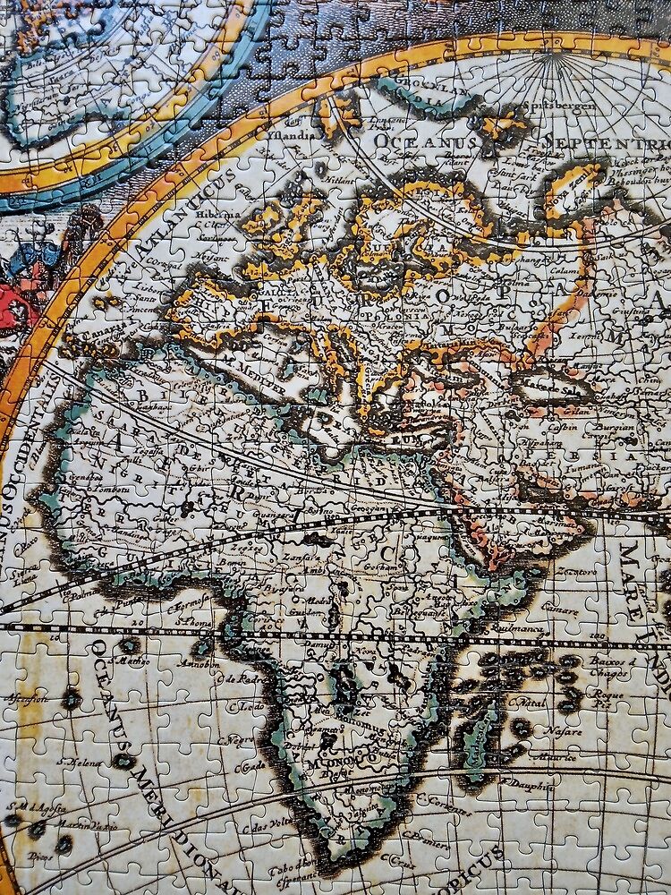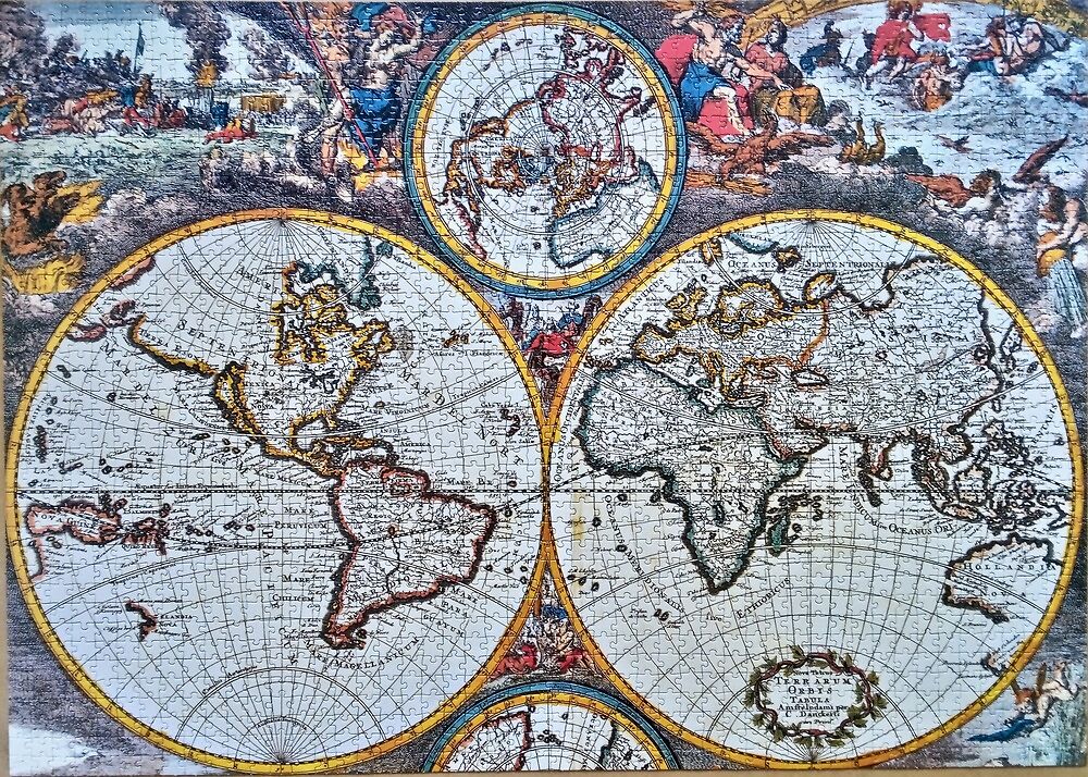 Almost all major brands have produced puzzles of ancient world maps. An example is the 2000 piece version of Map of the World from 1650, by Willem Blaeu, which Ravensburger published in 1992.