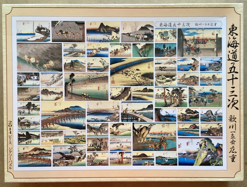 This is an extraordinary puzzle by the Japanese brand Yanoman. The title is The Fifty-three Stations of the Tōkaidō, with the classic set of paintings by Utagawa Hiroshige. It is a series of ukiyo-e created by Utagawa Hiroshige after his first travel along the Tōkaidō in 1832.
