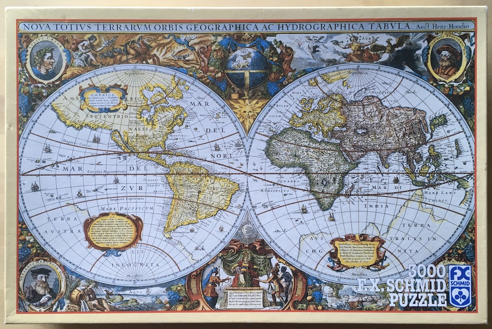 This is a very nice puzzle by F.X. Schmid. The title is Antique World Map. The complete title, however, is Nova Totius Terrarum Orbis Geographica Ac Hydrographica Tabula, by Henricus Hondius the Younger.