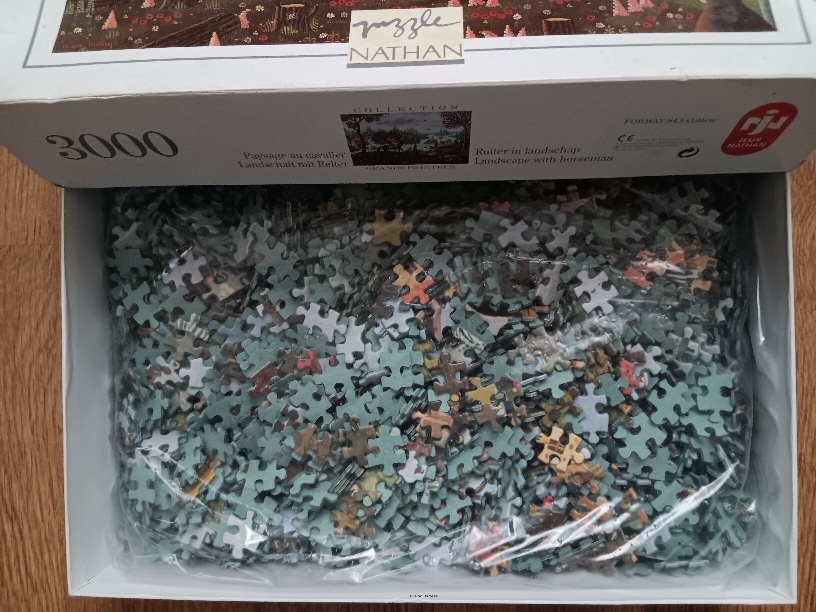 Nathan manufactured this very rare puzzle in 1994 and it is now very difficult to find. The title is Landscape with Horseman, by Alain Thomas, and it belongs to Nathan’s collection of Grands Peintres.
