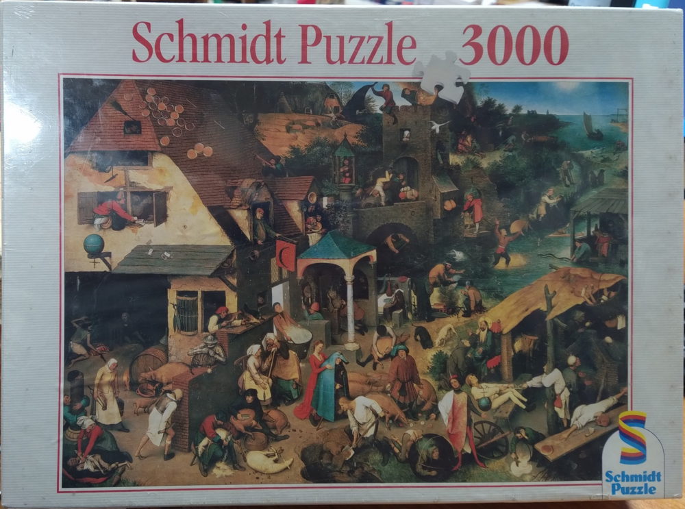 This is an extraordinary puzzle by Schmidt. The English title in the box is Dutch Sayings, although most people know this painting as Dutch Proverbs, by Pieter Bruegel the Elder.