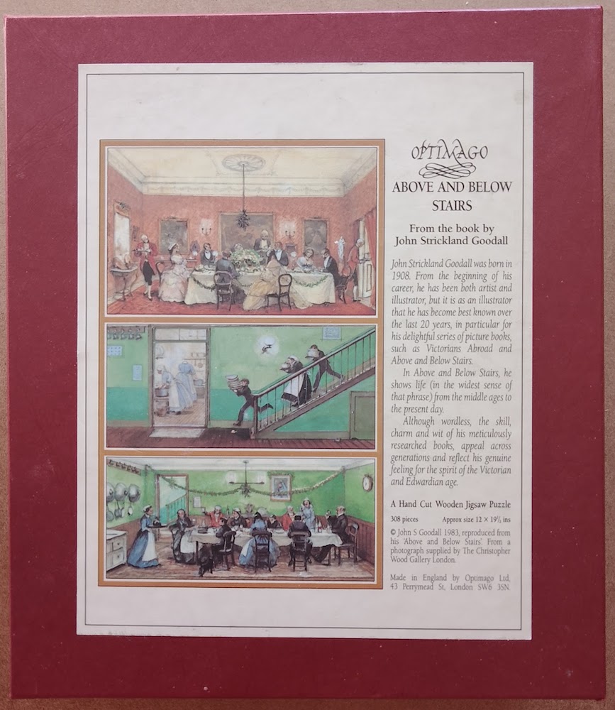 This is a very rare hand cut wooden puzzle by Optimago. The title is Above and Below Stairs, by John Strickland Goodall. Optimago Ltd were a prolific manufacturer of wooden jigsaw puzzles established in London in 1979. They ceased their activity in 2005. Their puzzles were not laser-cut. Instead, they preferred the more labor-intensive but traditional method of scroll saw cutting.