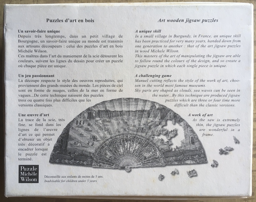This is a beautiful wooden puzzle by Michèle Wilson. The title is Le Banquet Estival, with a decorated hand fan from the 18th century. You can admire the original item at the Musée de l’Eventail, in Paris.