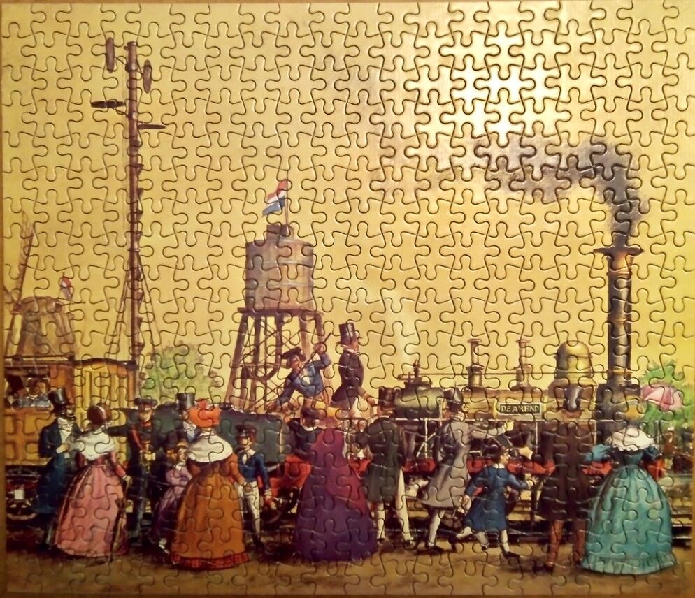Ravensburger manufactured this rare puzzle in 1969, as part of their Discovery & Invention series. The title is De Arend, Amsterdam, 1839, by the Dutch graphic illustrator Kees Kelfkens. The illustration commemorates the opening of the first railway line in the Netherlands, when the locomotive De Arend pulled the first train to link Amsterdam to Haarlem.