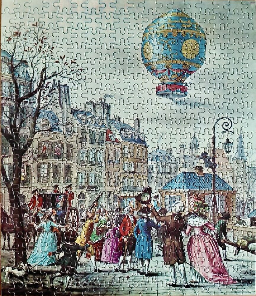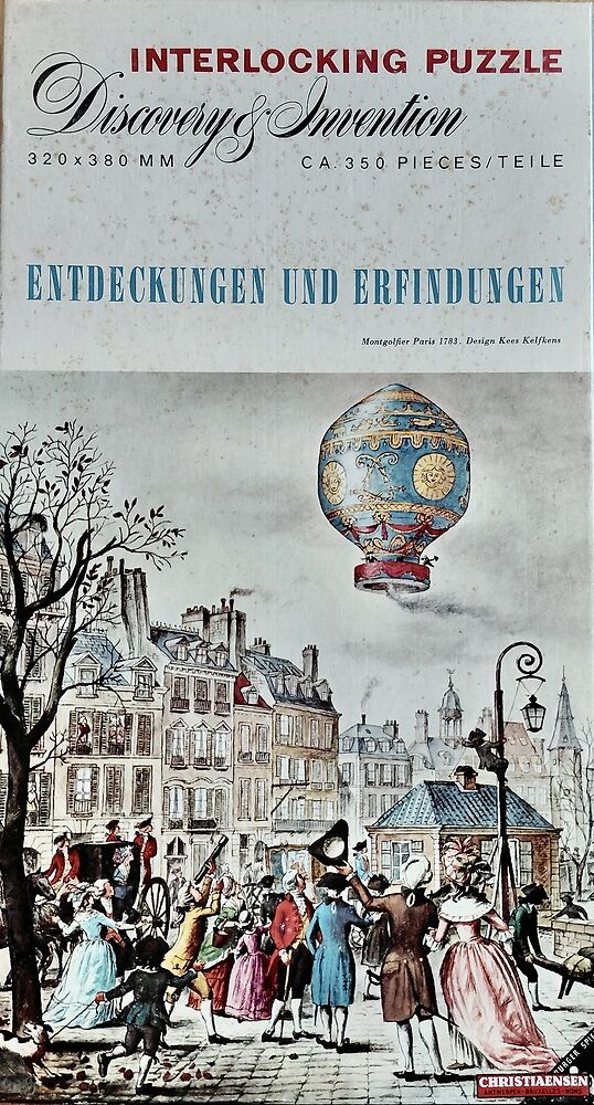 Ravensburger manufactured this rare puzzle probably in the 70’s, belonging to their Discovery & Invention series. The title is Montgolfier, Paris, 1783, by the Dutch graphic illustrator Kees Kelfkens. The illustration commemorates the first manned flight by a hot air balloon over the rooftops of Paris.