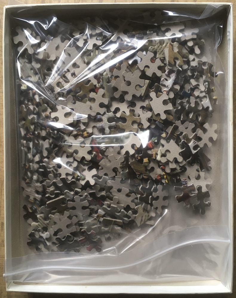 The puzzle is COMPLETE (360 pieces). The pieces are in good condition, with signs that the puzzle has been assembled before. The box is in good condition, with some shelf wear, some writing on on side, and a small depression on the base.