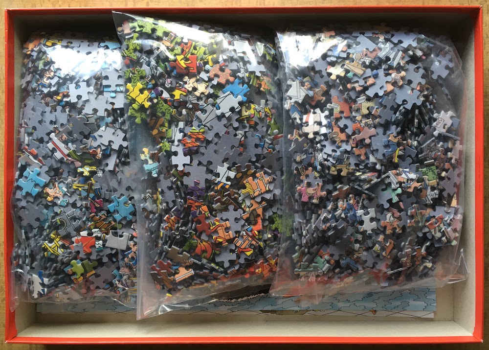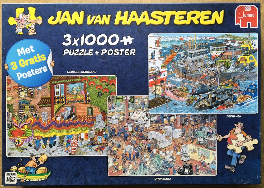 This is a very nice set of puzzles by Jumbo. It includes 3 puzzles with illustrations by Jan van Haasteren: Chinese New Year & The Puzzle Factory & Seaport. There was an error when they printed the box. The second illustration in the set corresponds to The Puzzle Factory, but they wrote The Printing Office, which is a different illustration.