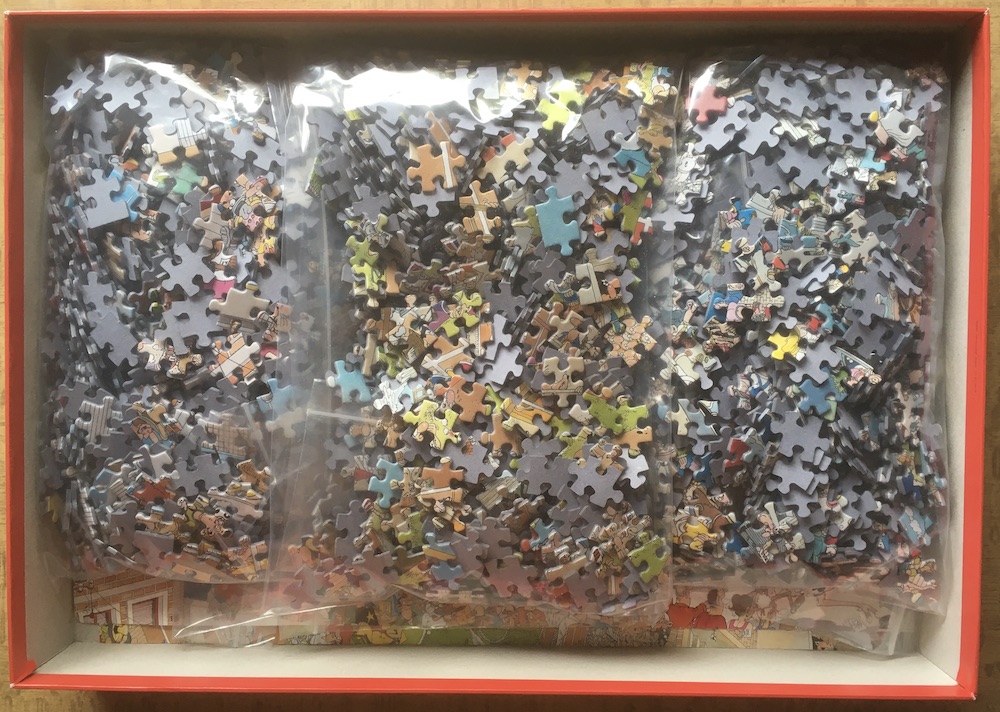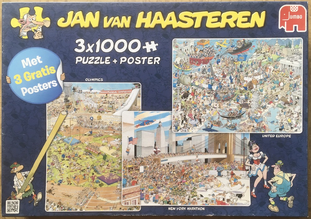 This is a very nice set of puzzles by Jumbo. It contains three illustrations by Jan van Haasteren: Olympics & New York Marathon & United Europe.