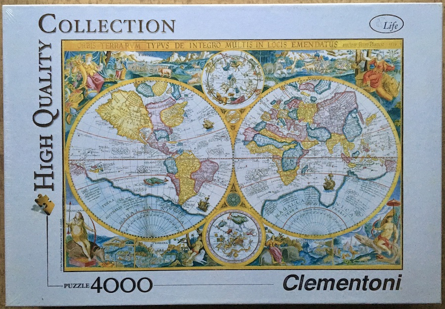 This is an excellent puzzle by Clementoni, as part of their Life collection. The title on the box is Antique Carta, although the real title of the map is Orbis Terrarum Typus De Integro Multis In Locis Emendatus, by Petrus Plancius. It appeared in Amsterdam in 1594 for the first time.