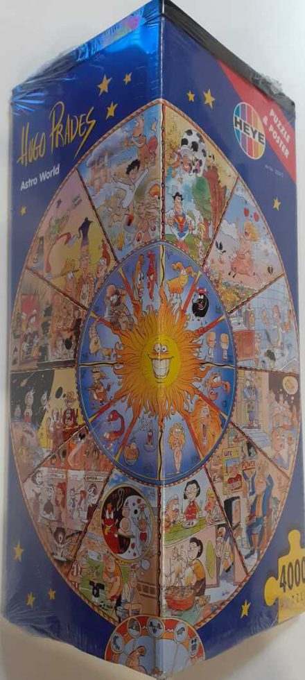 Heye produced this extraordinary puzzle in 2000. The title is Astro World, by Hugo Prades. Like most large Heye puzzles, it is in the top list of many collectors. And, like most large Heye puzzles, it is very difficult to find, especially in new condition.