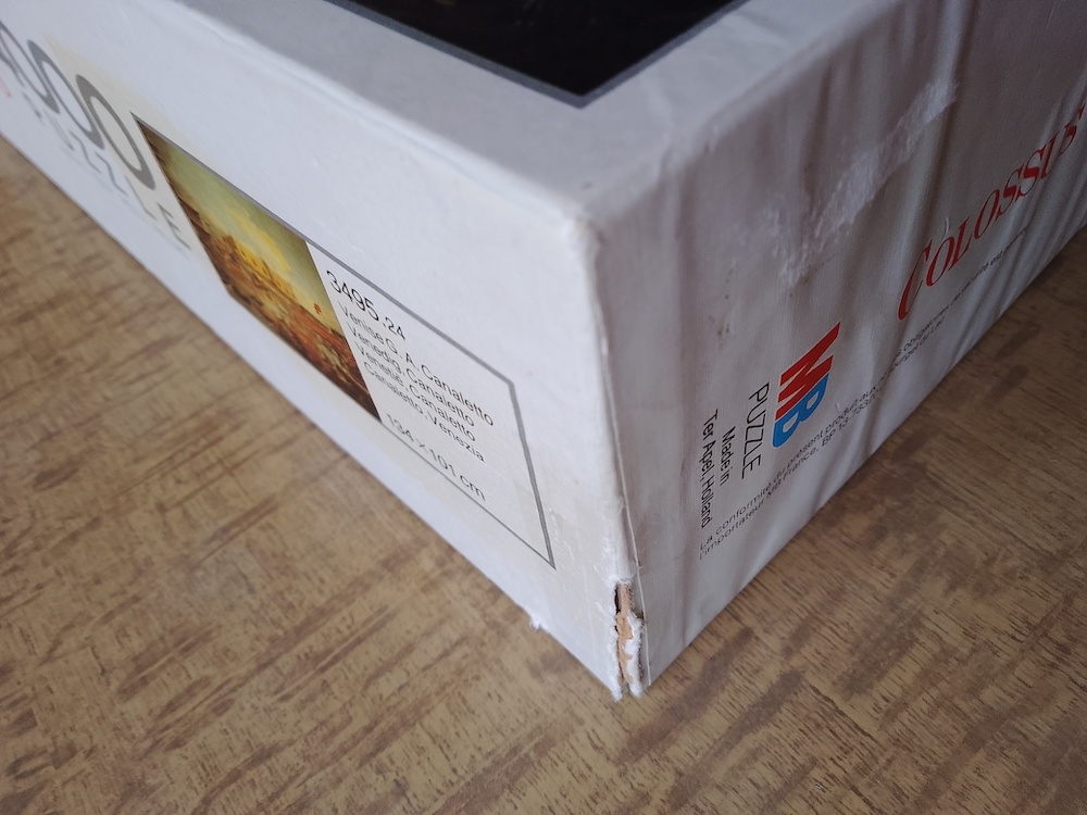 The puzzle is COMPLETE (4032 pieces). The pieces are in excellent condition, except for 3 border pieces with very minor damage, as you can see in the photographs. The box is in very good condition, with some wear and a partial tear on a corner.