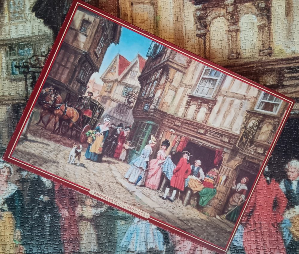 Waddingtons manufactured this puzzle in 1988. The title is Outside the Star, by the British artist Frank Moss Bennett. He is known for his portraits and his historical scenes and architecture.