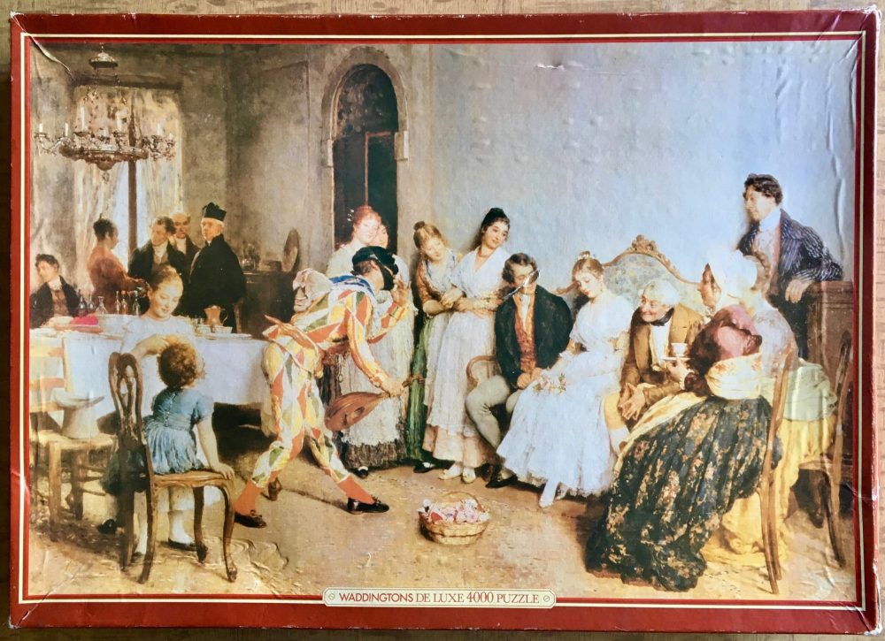 Waddingtons manufactured this beautiful puzzle in 1983, so it has been out of catalog for more almost 35 years now. For that reason, it is very difficult to find one copy in like new condition. The title is The Wedding Breakfast, by Eugene de Blaas.