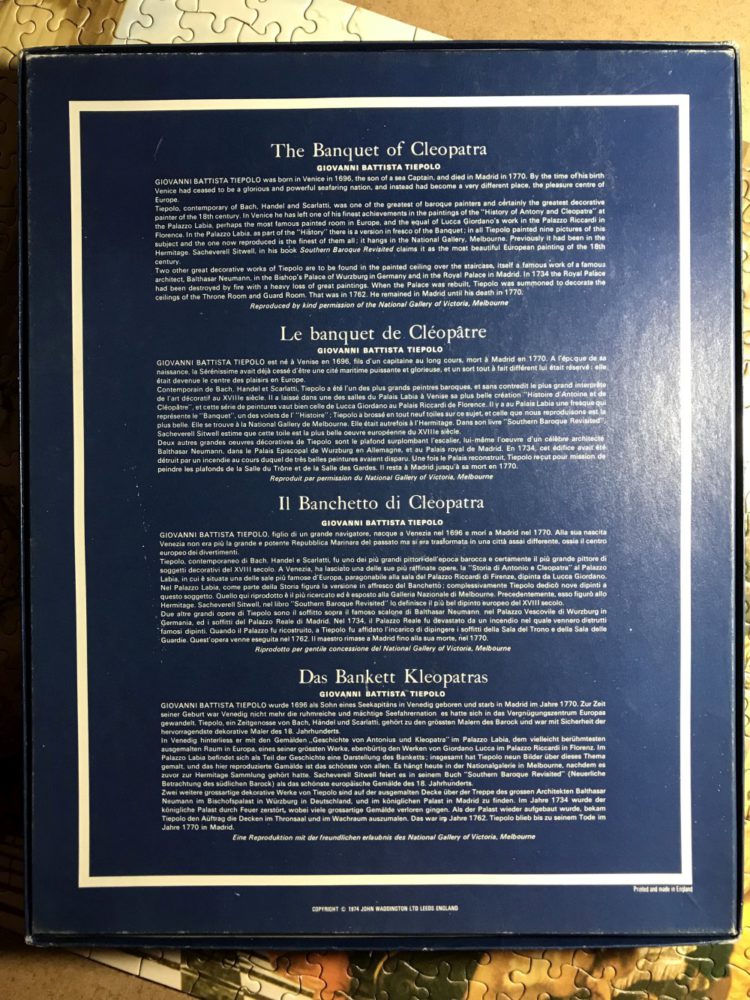 This is an old and very interesting puzzle. The company Waddington manufactured it in 1974. The title is The Banquet of Cleopatra by Giovanni Battista Tiepolo. More than 450 pieces and every piece is different.