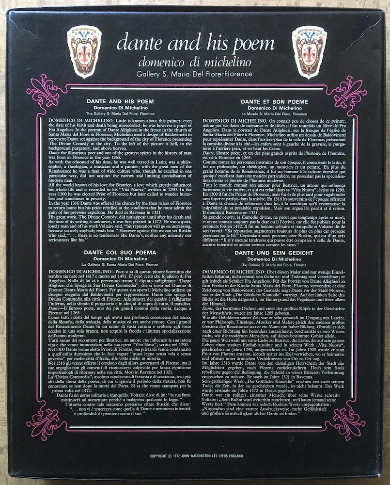 John Waddington Limited (which later would become just Waddingtons) published this puzzle in 1972. The title is Dante and his Poem by Domenico di Michelino. You can admire the original painting at Santa Maria del Fiore, in Florence.