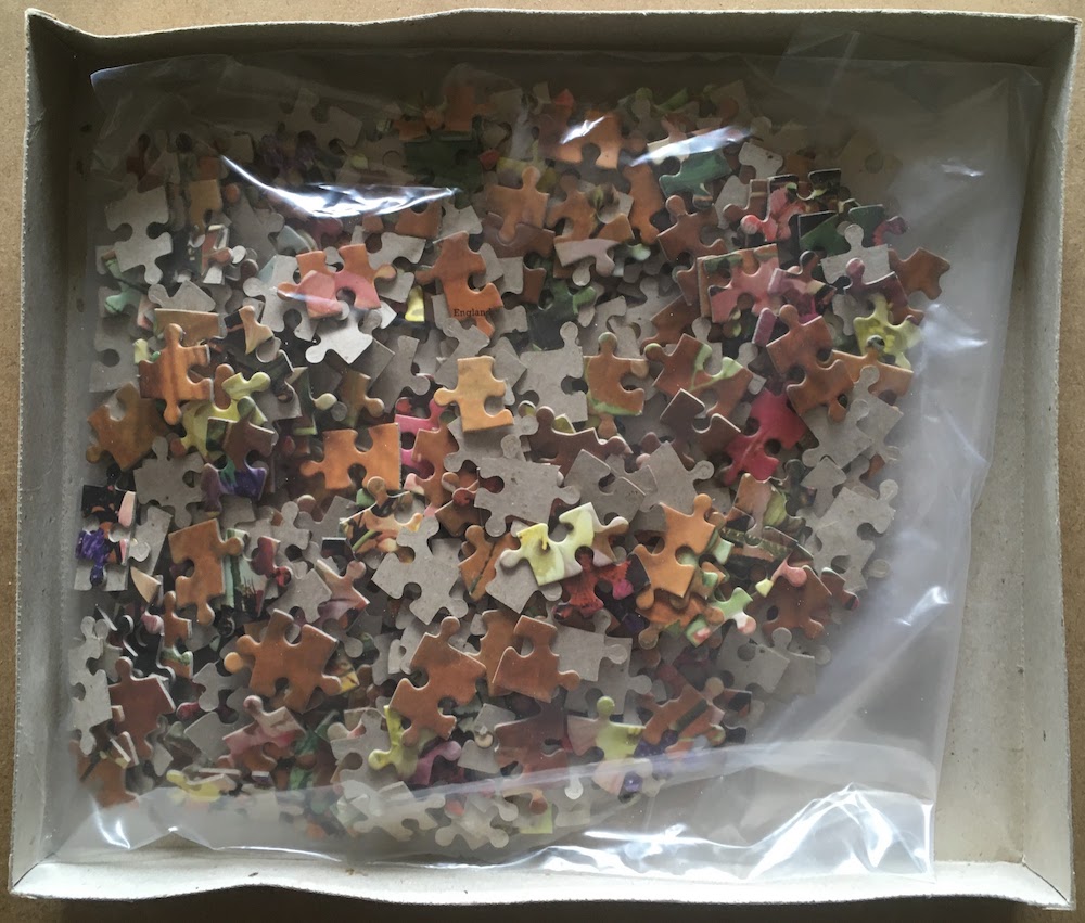 The puzzle is COMPLETE, as you can see in the photograph of the puzzle assembled. The pieces are in excellent condition. The box is in very good condition, with some shelf wear and a couple of tape remnants.