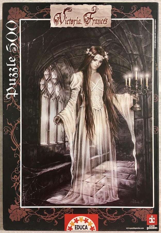 Educa produced this puzzle in 2008. The title is Candelabra, by Victoria Francés. Educa has published many puzzles with similar Gothic paintings which seems to be very popular. For that reason, most of these puzzles are becoming very difficult to find, even when they are not really very old.