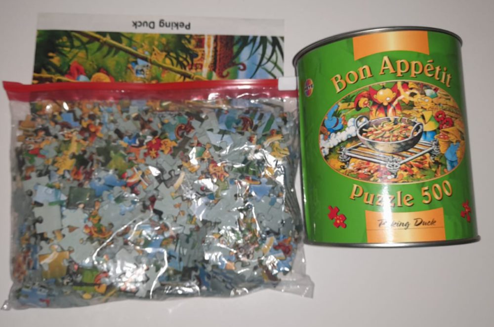 This is a small, but a very rare puzzle that Heye manufactured in 2001. The title is Peking Duck, by the German cartoonist Michael Ryba. Like most old Heye puzzles, it is now very difficult to find.