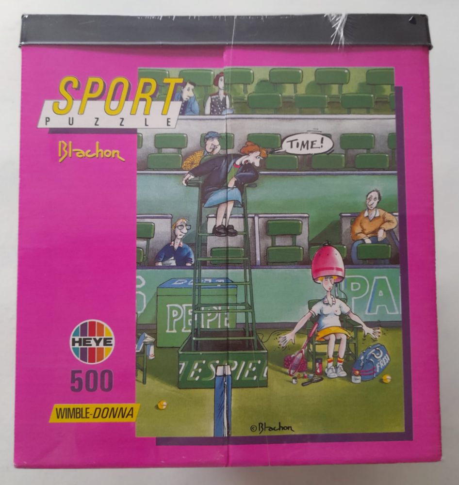 Heye manufactured this puzzle in 1991, as part of their Sport Puzzle series. The title is Wimble-Donna, by Rocher Blachon.
