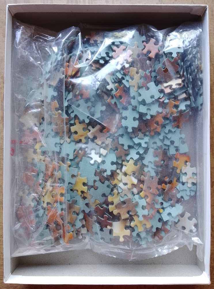 The puzzle is COMPLETE (500 pieces). The pieces are in excellent condition. The box is in very good condition, with some shelf wear.