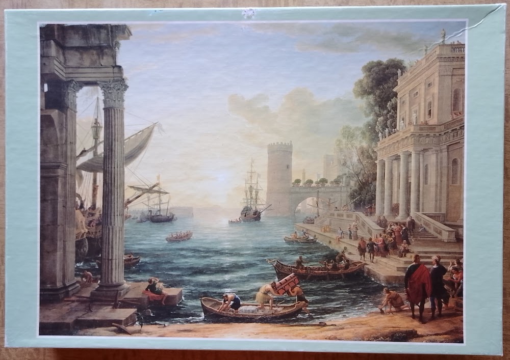 This is a very nice puzzle by JR Puzzles. The title is Seaport with the Embarkation of the Queen of Sheba, by Claude Lorrain. You can admire the original painting at the National Gallery, in London.