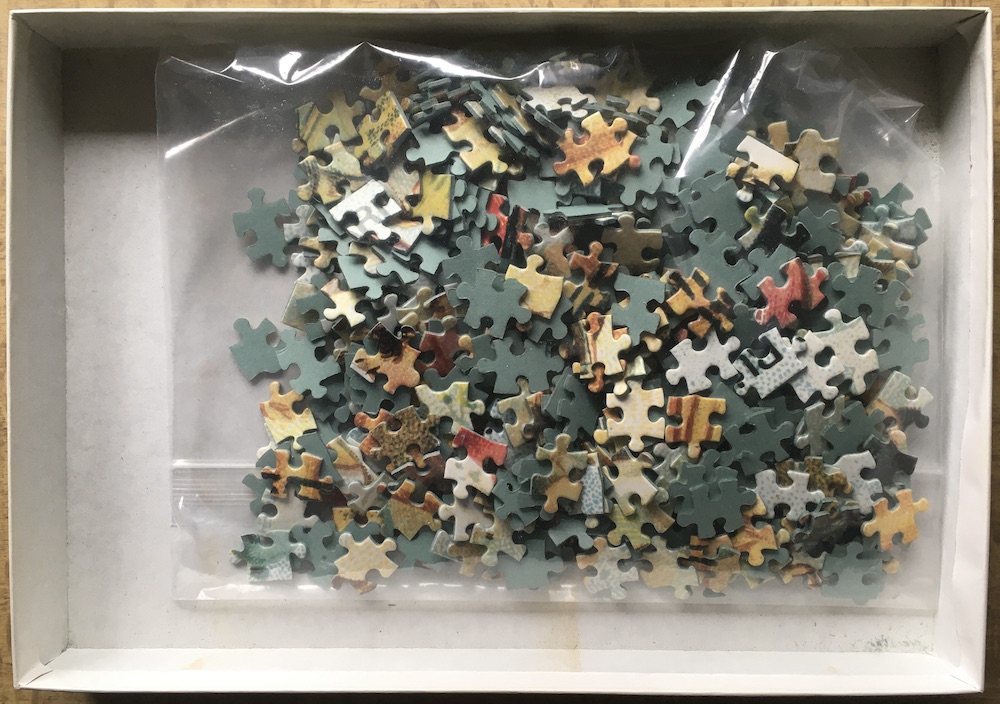 The puzzle is COMPLETE (500 pieces). The pieces are in excellent condition. The box is in very good condition, with some shelf wear, and minor tape tears.