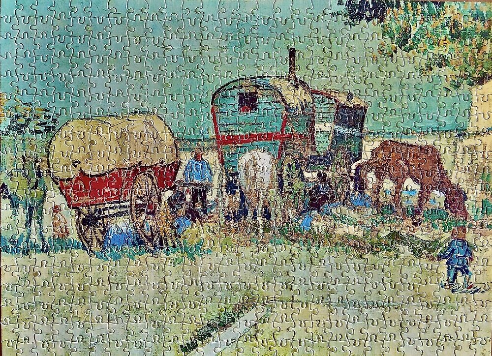 Nathan manufactured this rare puzzle in 1972. The title is Les Roulottes, by Vincent van Gogh.
