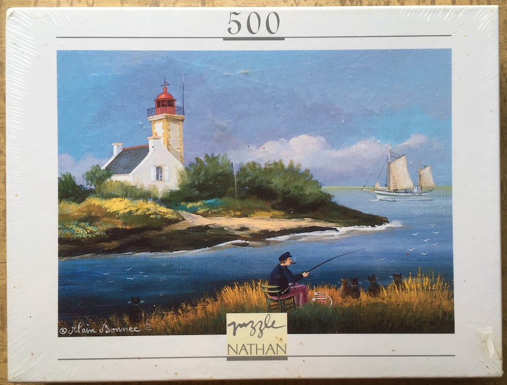 Nathan manufactured this puzzle in 1997, as part of their Évocation collection. The title is The Lone Angler, by the Bonnec Brothers (Daniel and Alain).