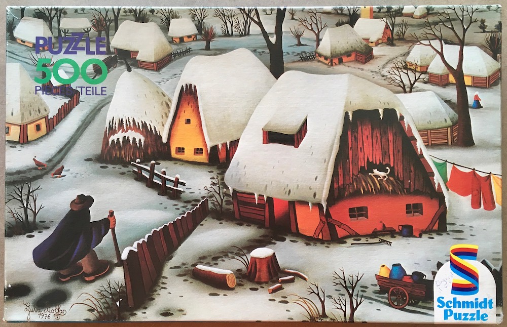 This is a very interesting small puzzle by Schmidt. The title is Winter, by Ljuba Stolfa. It belongs to the series Four Seasons, so it is safe to assume that there are other three puzzles in the series.