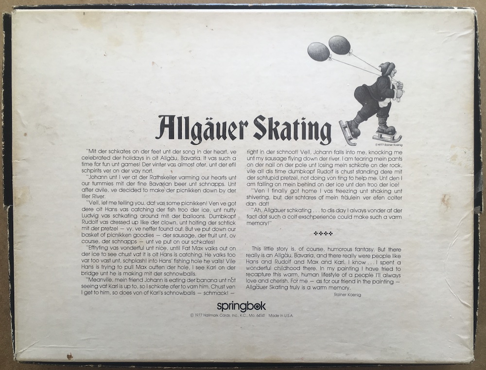 Springbok manufactured this very rare puzzle in 1977. The title is Allgäuer Skating, with an illustration by Rainer Koenig.