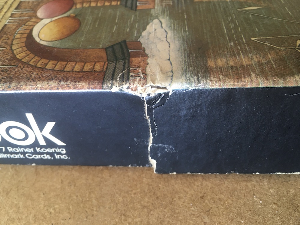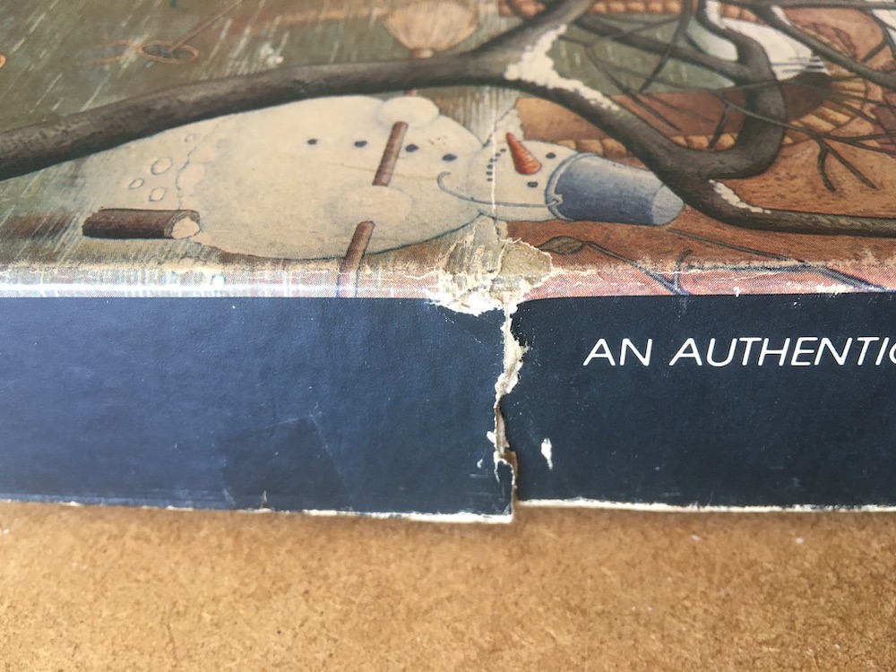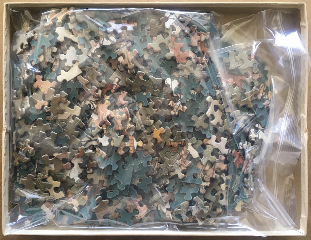 The puzzle is COMPLETE, as you can see in the photograph of the puzzle assembled. The pieces are in excellent condition. The box is in good condition, with some wear and scuffs, and four tears on the lid, as you can see in the photographs.