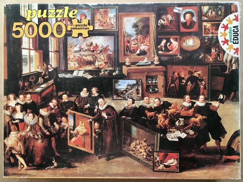 This is the first 5000 pieces art puzzle that Educa produced. Educa manufactured this copy in 1980, with the title Art Studio, Rubens’ House, by Willem van Haecht. Later, in 2002, they published a second edition, slightly different, with the title The Gallery of Cornelis van der Geest. Both editions are difficult to find, but this one is extremely rare, particularly in new condition.